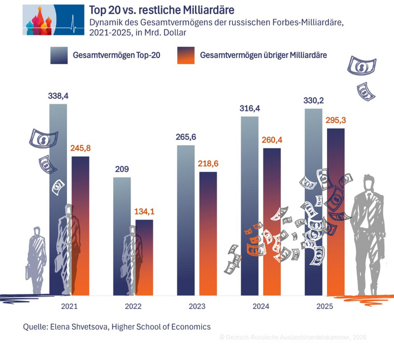 There are two drivers: on the one hand, high prices and stable export revenues, and on the other, takeover opportunities in the wake of Western companies pulling out. At the same time, new billionaire fortunes have emerged in domestically oriented sectors such as retail, agriculture, housing construction, and e-commerce.