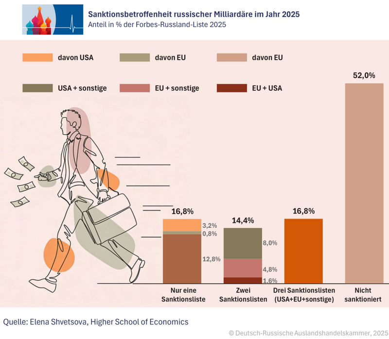 A systematic evaluation of Russian billionaires' reactions to Western sanctions since 2022 is provided in a recent study by Elena A. Shvetsova from the elite Moscow university Higher School of Economics. The study covers the period from February 2022 to January 2025 and is based on the Forbes Russia ranking of the 125 richest businesspeople in 2024. Open sources are supplemented by registry data (SPARK-Interfax).