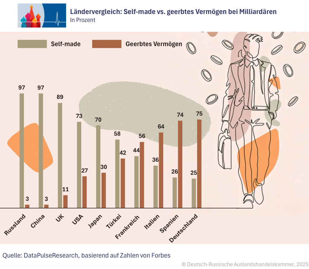 In contrast, around 97% of Russian billionaires are classified as self-made, indicating that wealth in Russia has predominantly been created in the recent past through individual business start-ups and expansions, often linked to export-oriented commodity and industrial businesses. This distinguishes the Russian elite from the German elite: while the latter often derives its top positions from long-established family businesses, the Russian billionaire class is predominantly based on assets acquired since the collapse of the Soviet Union.