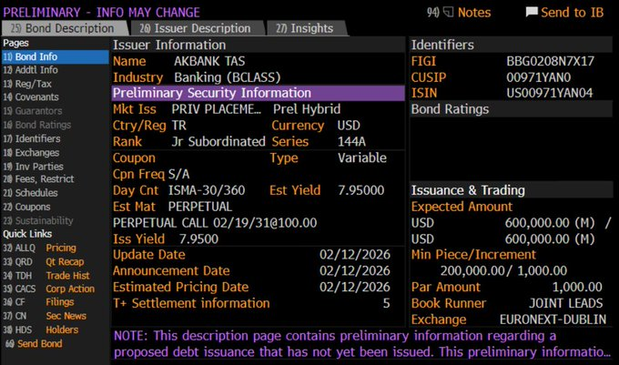 The issue was accompanied by Citigroup, Emirates NBD, First Abu Dhabi Bank, HSBC, JPMorgan, and Merrill Lynch. Fitch rates Akbank BB-/Positive, Moody's Ba3/Stable.