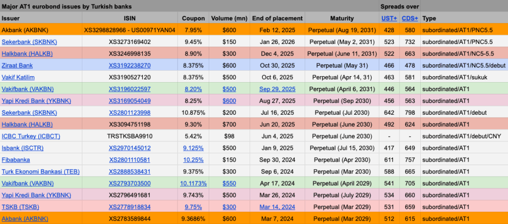With a coupon of 7.95 percent, the bond is considered the cheapest AT1 issue by a Turkish bank to date. In August, Yapi Kredi offered 8.25 percent, and in October, Vakifbank undercut this mark with 8.20 percent. Akbank is now setting a new record – and at the same time significantly improving its own terms: in March 2024, the institution had to pay 9.37 percent for a comparable security.